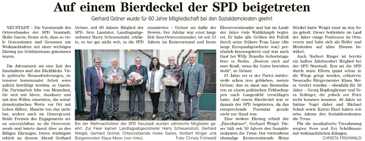 Weihnachtsfeier der SPD Neustadt – Ehrung für 60 Jahre Mitgliedschaft