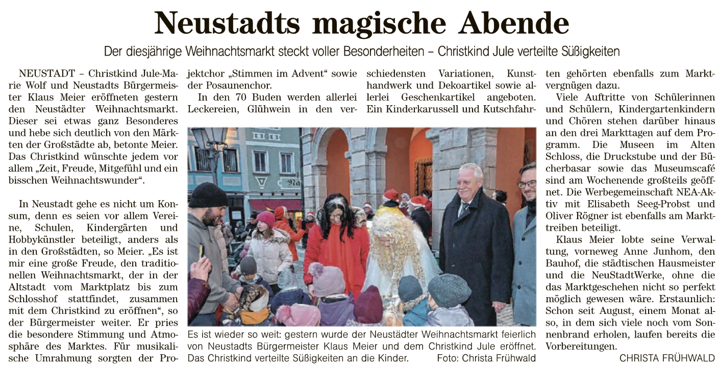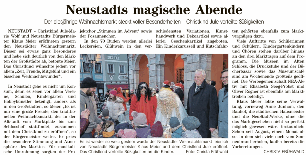 Ein herzliches Dankeschön geht an die Fränkische Landeszeitung und Christa Frühwald für den einfühlsamen und wertschätzenden Bericht. Er bringt genau das auf den Punkt, was unseren Weihnachtsmarkt ausmacht: Herzlichkeit, Miteinander und eine ganz besondere Atmosphäre mitten in unserer Stadt.